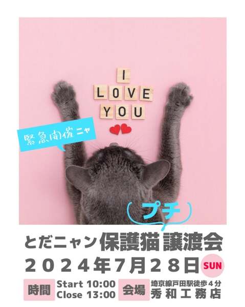 | イベント内容 | 今月も保護猫譲渡会を開催します。 日程 7月28日(金) 時間 AM10時00分~13時00分まで 場所 秀和工務店 JR埼京線 戸田駅 東口 徒歩4分 住所 埼玉県戸田市新曽309−1 ヤオコーから徒歩90秒のところにあります。 駅周辺にはコインパーキングも複数あります。。 今回、展示する猫は子猫3頭と若い成猫1頭となります。 注意:子猫の場合トライアルはありせん 展示する猫の様子などはブログをご覧ください。 アメブロ↓ https://ameblo.jp/sakutotaro203/ インスタ↓ @kiyasa_rin 募金箱を設置します。 募金のご協力をお願いします。 ご支援のお願い 【フード】 カリカリ ウエット おやつ(チュールは間に合っています) 銘柄なんでもOK。ただし賞味期限以内のものでお願いします。 【トイレシート】 薄型200枚入りレギュラーご支援頂けると助かります。 【トイレ砂】 現在使っているのはユニ・チャームペットデオトイレ緑茶成分入り紙タイプ4リットルです。 ですがご家庭にあるもので余っているのがありましたら何でもOKです。 【その他】 タオル 洗濯洗剤 猫用おもちゃ 猫用ベット等新品または洗濯済のものでお願い致します。 。 沢山のご来場をお待ちしております。 どうぞよろしくお願いいたします。 主催 とだニャン 協力 秀和工務店 |