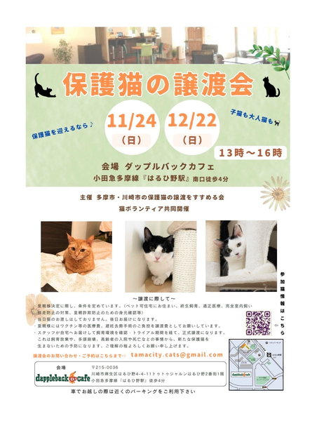 | イベント内容 | 多摩市・麻生区を中心に猫ボランティア協働で保護猫の譲渡会を開催しています。 事情があって保護された猫さんたちが参加予定です。 チラシに付いてるQRコードまたはこちらのリンクから 猫たちの様子が見れます。 https://sites.google.com/view/cooneru/ 完全予約制ではありませんが、予約された方から優先的にご案内致します。 参加お申込み・お問合せはコチラ tamacity.cats@gmail.com 【日時】9月29日(日)13:00-16:00 【場所】ダップルバックカフェ カフェ隣のお部屋になります 神奈川県川崎市麻生区はるひ野4-4-11 トゥトゥジャルダンはるひ野二番街1F (小田急多摩線「はるひ野駅」南口から徒歩約2分 京王線「若葉台駅」から徒歩16分) ※車でお越しの際は 近隣のコインパーキングをご利用下さい 【譲渡までの流れ】 ①譲渡会にて猫を決めたら預かりボランティアに話を聞く ②エントリーシートに記入 ③お届け(里親様宅へお伺いします) ④トライアル期間 ⑤誓約書を交わして本譲渡 【譲渡地域】 多摩市・府中市・日野市・八王子市・立川市・国立市・稲城市・相模原市・町田市・麻生区他 【譲渡条件】 ①ペット可住宅にお住まいで、同居の方全員の了解がある。 ②経済的・体力的・時間的に猫を養える見込みがある ③完全室内飼い ④終生飼育 ⑤子猫の場合は留守にする時間が短いご家庭 ※単身者・高齢者の方には後見人必須 |