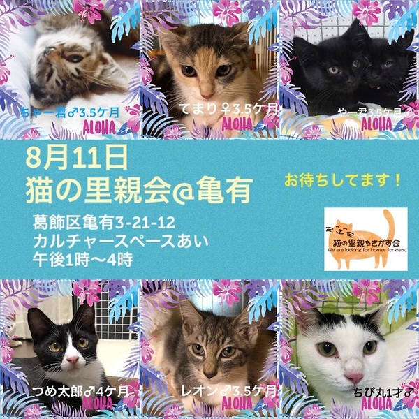 | イベント内容 | ご質問大歓迎です。 分からない事などなんでも聞いて下さい。 ご家族の皆様で生涯、家族の一員としてたっぷり愛情を注いでくださるご家庭をお待ちしております。 ご希望に添えない場合もございますのでご了承下さい。 【以下の方には譲渡しておりません】 ・猫の飼育が許可されていない住居にお住まいの方 ・未成年者、友人同士&同棲でお住まいの方、乳児のいるご家庭 ・単身者、高齢者のみのご家庭の方 ・脱走防止対策にご協力頂けない方 ・経済的に不安定な方(休職中、就職活動中、アルバイト等) ・仔猫の場合は留守番多いご家庭 ・住居の構造を聞かせていただく事があります。(階下への騒音など) 【当里親会は猫さんと里親様とのマッチングを大切にしています】 はじめて猫さんをお迎えする場合に適した猫さん、お留守番の長い里親さんに適した猫さん等、 お迎えする不安など経験豊富なスタッフがお話を聞き、アドバイスさせていただいています。 お気軽にお声をかけてください。 【ご負担頂く費用について】 譲渡の際に譲渡負担金(医療費の一部、譲渡金、お届け時の交通費)を里親様にご負担頂く事により 飼い主のいない猫の継続的治療や保護、新しいご家族の元へ送り出す事ができます。 ご理解とご協力をお願い致します。 ◆ご負担頂く医療費につきましては個々の猫(子猫、成猫、♂、♀)によって異なります◆ ★仔猫10.000~15.000 (ワクチン・ウイルスチェック・駆虫) ★成猫18.000~20.000 (ワクチンウイルスチェック・駆虫・不妊去勢手術済) ★猫をお届けする時の交通費をいただいております。 1500〜実費 【譲渡の条件がございます】 ①終生飼育 ②完全室内飼育 ③不妊・去勢手術 ④譲渡負担金 ⑤契約書の署名捺印 ⑥定期報告義務をご了承ください。 トライアル期間は全ての猫さんに設けております。 トライアル期間を経て初めて正式譲渡となります 【猫の里親をさがす会】 https://blog.goo.ne.jp/bobton https://twitter.com/shosukereiko |