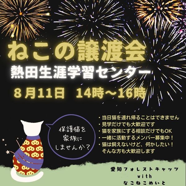| イベント内容 | 日時 8月11日(日) 14時〜16時 場所 熱田生涯学習センター 主催 愛知フォレストキャッツwithなごねこめいと 地域猫活動やTNR活動の過程などで 保護した猫たち 子猫もいれば、大人猫もいます 見学、相談だけでも大丈夫! 予約不要、参加費無料なのでお気軽に 猫に関する活動を何かしたい、という方も歓迎です 遊びに来る感覚で、お越しくださいませ ☆猫に関して☆ 各団体の保護主さんごとに決めているお約束事があります ・当日は猫を連れ帰ることはできません ・猫を迎えるにあたり、飼育環境などについて お話しをさせていただきトライアル(お試し飼育) から始めさせていただきます ・2週間前後のトライアル期間を経て、問題ない ようであれば、譲渡契約書を結び正式譲渡と なります ・所定の譲渡費用をいただきます |