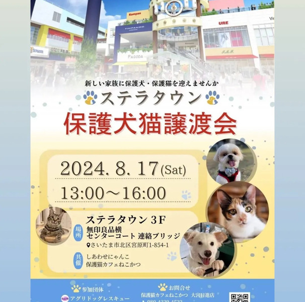 | イベント内容 | *保護犬猫讓渡会* 日時:8/17(土)13時~16時 場所:ステラタウンさま ステラタウンさま譲渡会に参加予定です。 センターからの引き出し、飼育崩壊や所有権放棄などで、生きる場所を失った猫たちが、最大限の医療にかけてピカピカになりました。 写真の猫の他にも甘えっこちゃんたちが、溢れる笑顔でお待ちしています。 ぜひご参加ください。 ***譲渡条件*** *完全室内でお願いします。 *逸走防止対策にご協力頂ける方 *写真付きの身分証をご提示頂ける方 *LINE若しくはメールでのやりとりが可能な方 *譲渡に関する覚え書きにご署名頂ける方 *初期医療費をご負担頂ける方 *その他の譲渡条件を、譲渡会場でお話させて頂ける方 *猫が生まれた年から20年後に、80歳を超えていない方 *お一人暮らしの方は、後見人さまのご同席が必要です。 |