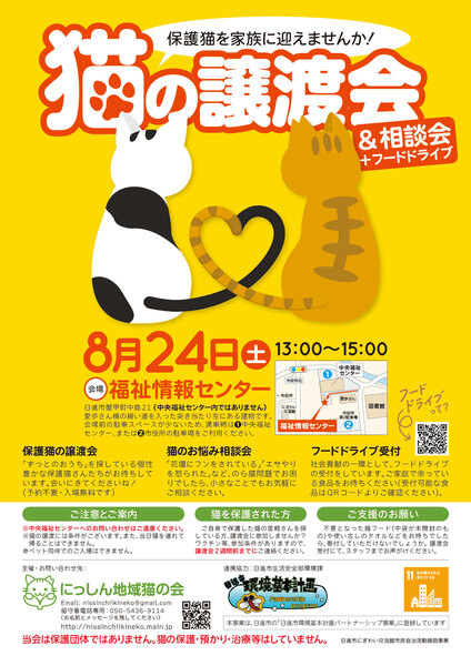 | イベント内容 | 8月24日(土)に「猫の譲渡会&相談会」を開催いたします。 保護猫を迎えたい方はもちろん、猫に関する相談会も同時開催しております。 ご近所との猫トラブルなどでお悩みの方も、どうぞお気軽にお立ち寄りください。 地域貢献の一環として、フードドライブの受付もしております。 ご家庭や職場で余っている食品がありましたらぜひお持ちください! (受付できる食品はホームページでご確認ください) 小さな譲渡会ですが、猫さんも人間も良いご縁を紡げられるよう、のんびり続けています。 遊びにきてくださいね(*^^*) 【日時】8月24日(土)13:00〜15:00 【会場】福祉情報センター ★★★ご注意★★★ 会場は「中央福祉センター」の中ではありません。 その隣の奥まったところにある「福祉情報センター」という小さな建物で開催しております。 お手数ですが、チラシやホームページの地図をご確認の上お越しください。 ★★★★★★★★★ 【入場無料・予約不要】 【主催】にっしん地域猫の会 【ホームページ】https://nissinchiikineko.main.jp ※会場前に駐車場がございますが、数が少ないため、満車時は中央福祉センターの駐車場をご利用ください。図書館のむかいにある市役所の臨時駐車場もご利用いただけます。 ※室内換気のため冷暖房が効きにくい場合がございます。 ※ペット同伴のご入場はできません。 ※猫ちゃんの譲渡には条件がございます。詳細はホームページをご参照ください。 |