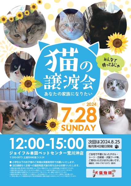 | イベント内容 | ジョイフル本田ペットセンター荒川沖店にての猫の譲渡会です。 あなたとの出会いを待つ猫にぜひ会いにきてくださいませ。 12時~15時開催です!! ●犬猫物語は土浦を中心とし保護活動、野良猫の避妊去勢などを行っている団体です。 犬猫の相談などはお電話くださいませ。 譲渡会への猫の参加も受け付けております。 当日いきなりの参加は不可能ですが、事前にご連絡ください。 お待ちしています(^^ 問い合わせは09017673372鈴木まで。非通知には出ません。 |