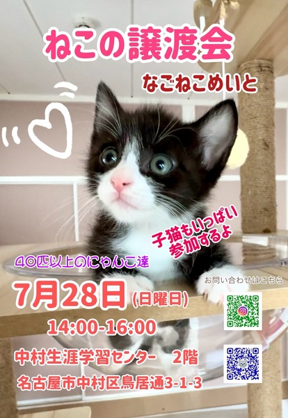 | イベント内容 | ねこの譲渡会 40匹以上の子猫から落ち着いた成猫が優しいパパ、ママ、ご家族とのご縁を探して譲渡会に参加します。 暑さにも負けず、それぞれのボランティアさんのお家から大集合! 入場料無料 予約不要 ご家族一緒に!おひとり様でも! お気軽に是非ご来場下さい。 |