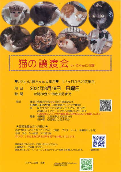 | イベント内容 | 猫ちゃんの譲渡会を開催いたします。 1.5ヶ月位からの猫さん20匹位 大人猫さんも参加です。 月 日 2024年 8月18日 日曜日 時 間 12時30分~15時30分まで 場所 神奈川県横浜市保土ケ谷区川島町360-6 川島第三町内会館(川島地域ケアプラザ裏側) 車 保土ケ谷バイパス新桜ヶ丘インターから8分 近隣のコインパーキングにお願いいたします。 (手前にある川島地域ケアプラザの駐車場には停めないでください) 電車 相鉄線 上星川駅より徒歩10分 相鉄線 西谷駅より徒歩15分 ★里親希望さまへお願い★ 必ず予約をしてからおいでください。 各回 30分 3~4組様 おいでになる方全員の氏名住所を記入をお願いいたします。 譲渡条件があります。お問い合わせください。 ご確認の上、ご応募ください。 猫の譲渡について http://nyankorotai.blog.fc2.com/blog-category-5.html 上記の譲渡条件をコピーペーストして下記アドレスへ送ってください。 追ってご連絡いたします。 お電話にても受付いたします。 下記の譲渡条件を送ってくださっても大丈夫です。 ◆ご応募時に下記事項をお知らせください◆ 1.お名前、簡単な住所 2.先住動物の有無(ワクチン 不妊手術の有無等)と選んだ理由 3.家族構成(家族全員の年齢 関係 お仕事等) 4.住宅環境(一戸建て 分譲マンション 一戸建て賃貸 賃貸マンションペット可) 5.留守番の時間 6.下記の①~⑨までの同意 ◆応募者様へのお願い◆ ①一生涯、家族の一員としてくださる事(猫は20年生きます) ②完全室内飼いでお願いします。 (脱走防止対策をお願いします。ケージ 脱走防止扉 玄関窓等) ③不妊手術及び毎年のワクチン接種など健康管理 (不妊手術済のご連絡は必須) ④家族全員の同意があること ⑤ペット可住宅にお住まいであること。 (ペット不可にお住まいの方には譲渡できません) ⑥身分証明の提示及び誓約書を記入していただきます。 ⑦譲渡後の近況報告をしていただける方 ⑧譲渡費用等をご負担できる方 (初期医療行為は済ませてお届けします) ⑨ほとんどの猫さんがお外から保護した子です。 その辺の事をご理解していただける方 猫が小さい場合はお留守番の短い家を希望します。 ケージのご用意をお願いいたします。 申し訳ありませんが先住動物さんが4匹以上のご家庭はお断りさせていただいております。 無職 学生 未成年の方からの申込は受け付けておりません。 ご家族に未就学児のいるお家及び高齢者の方は要相談 2匹一緒を優先させていただきます。 双方の条件が合った場合は譲渡会又は保護先にお見合にきていだだき成立後に自宅室内へお届けいたします。 この時期なので近くに方を優先させていただく事もあります。 ご予約お待ちしております。 にゃんころ隊 http://nyankorotai.blog.fc2.com 担当 北澤(にゃんころ隊) chieminn4057@icloud.com |