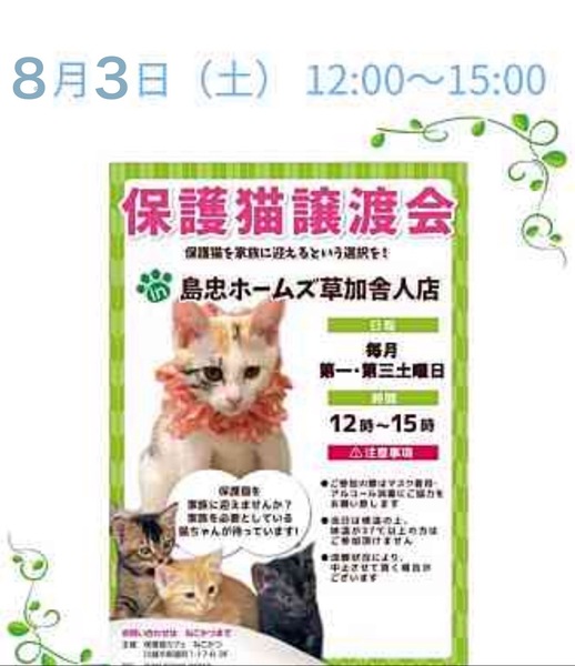 | イベント内容 | *保護猫讓渡会* 日時:8/3(土)12時~15時 場所:ホームズ草加舎人店さま 島忠ホームズ草加舎人店さま譲渡会に参加予定です。 センターからの引き出し、飼育崩壊や所有権放棄などで、生きる場所を失った猫たちが、最大限の医療にかけてピカピカになりました。 写真の猫の他にも甘えっこちゃんたちが、溢れる笑顔でお待ちしています。 ぜひご参加ください。 ***譲渡条件*** *完全室内でお願いします。 *逸走防止対策にご協力頂ける方 *写真付きの身分証をご提示頂ける方 *LINE若しくはメールでのやりとりが可能な方 *譲渡に関する覚え書きにご署名頂ける方 *初期医療費をご負担頂ける方 *その他の譲渡条件を、譲渡会場でお話させて頂ける方 *猫が生まれた年から20年後に、80歳を超えていない方 *お一人暮らしの方は、後見人さまのご同席が必要です。 |