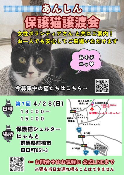 | イベント内容 | 4/28(日)13:00〜15:00 第⑦回「あんしん保護猫譲渡会」を開催します! 保護猫シェルターにゃんとは 男性代表のシェルターということもあり、 「女性が1人で来づらい…」 そんな声を反映し、 女性ボランティアさんご協力のもと共にご案内いたします! ■場所 保護猫シェルターにゃんと 前橋市田口町851-3 ■駐車場 隣にあり。4〜5台停められます。 ※赤い日以外は駐車厳禁 お気軽にどうぞ〜! #保護猫譲渡会 #保護猫シェルターにゃんと #譲渡型保護猫シェルター |
