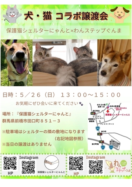 | イベント内容 | 第⑪回 5/26(日)※26日のみ「犬・猫コラボ譲渡会」を開催します! 時間は【13:00〜15:00】 犬の団体、わんステップ・ぐんまさん(@wanstepgunma )とコラボして犬猫の譲渡会を開催いたします! 今回の犬猫コラボ譲渡会、大拡散希望です‼️ ■わんステップ・ぐんまさん HP https://wanstepgunma.web.fc2.com/ インスタ @wanstepgunma 犬と人とが“より良く共生できる環境”と“動物福祉”のステップアップを目指す 群馬県前橋市を中心に活動している非営利のボランティアチームです。 保護猫シェルターにゃんとは 男性代表のシェルターということもあり、 「女性が1人で来づらい…」 そんな声を反映し、 女性ボランティアさんご協力のもと共にご案内いたします! ■場所 保護猫シェルターにゃんと 前橋市田口町851-3 ■駐車場 隣にあり。4〜5台停められます。 ※赤い日以外は駐車厳禁 お気軽にどうぞ〜! #わんステップぐんま #保護猫シェルターにゃんと #犬猫コラボ譲渡会 #保護猫譲渡会 #譲渡型保護猫シェルター #保護犬譲渡会 |