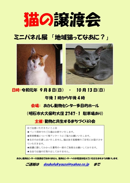 | イベント内容 | ミニパネル展 「地域猫ってなあに?」同時開催 ★★★猫を家族に迎えたい方へ★★ 様々な毛色や目の色の可愛い猫たちがたくさん集まります。この機会にどうぞ運命の出会いをしてくださいね。 今回の譲渡会に参加する猫の約1/3は、明石市中部で、約60匹を飼育、その大半をケージに何年も閉じ込めて飼っておられるお家からの参加です。 その家の猫たちは、長年狭いケージから出たことがなく、ごはんの時間だけを楽しみに生きてきました。新しい飼い主を探すこと以外に今の状況から救ってやることができません。 前回の譲渡会では、見知らぬ人を怖がり固くなりながらも、背中を撫ででもらうと嬉しくて、前足をフミフミする子もいました。愛情を求めているのですね。 どうぞ、怖がりさんの背中をそっと撫ででやってください。きっと時間と共に心を開き、あなたの良き家族に、そして癒しになってくれることでしょう。 猫を飼うことが初めての方でも、先住猫のいるお家でも、大型ケージをお貸ししたり、アドバイス等、私たちボランティアがしっかりとサポートをしますのでご安心ください。 ★★★「地域猫ってなあに?」ミニパネル展★★ あなたの地域では、猫の糞や鳴き声に困っていませんか。捨てられたり迷ったりした猫が増え、餌を与える人と糞害に悩む人の間に「対立」が生まれ町内がギクシャクする困りごとが、日本全国で起きています。 これを解決するのが、猫の避妊去勢手術と餌やトイレの管理を行って自然に猫を減らす「地域猫活動」です。お子様が「命の重さ」を自然と学ぶことができる取組です。 明石市には「飼い主のいない猫の避妊去勢手術」に対し「助成金制度」があります。自治会で「地域猫活動」に取組んでおられるところも多数あり、「子猫が生まれなくなった」「猫が減ってきた」など喜びの声が聞けるようになりました。「助成金制度」については「あかし動物センター」にお尋ねください。 ★★★「多頭飼育崩壊」をご存知ですか?★★ 適正に世話ができる数をはるかに超えて犬猫を飼育し、臭いや鳴き声等の近隣への迷惑により、退居を迫られるなどして、犬猫が取り残される「社会問題」です。犬猫はたいてい悲惨な状況で飼われており「虐待罪」に相当する可能性もあります。 これをふせぐ方法はただひとつ!! 1匹目を飼った時に「避妊去勢手術」をすることです。 もし、周りに気になる方がいらっしゃる場合、「避妊去勢手術していますか」と声をかけ、あかし動物センターに相談してみましょう。私たちも避妊去勢手術に協力しています。 動物と共生するまちづくりの会 https://www.facebook.com/akasidoubutu/ あかし動物センターの譲渡会ではありません。動物センターへのお電話は控えていただきますようお願いします。 ご連絡は doubutukyousei@yahoo.co.jp まで |