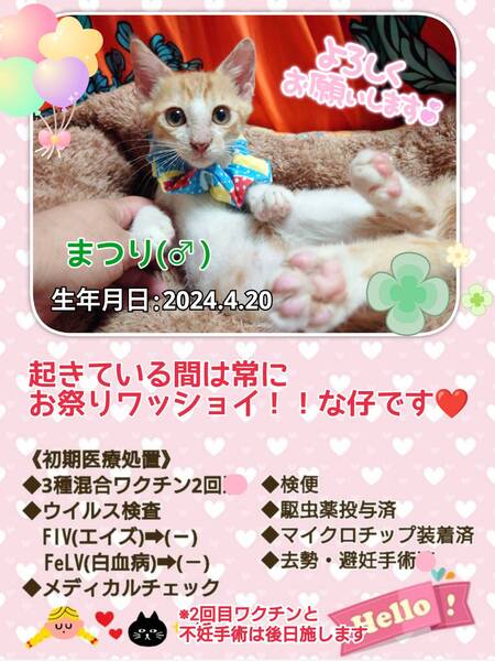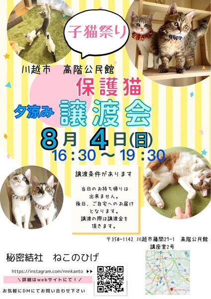 | イベント内容 | 【秘密結社ねこのひげ☆保護猫譲渡会】 8/4(日) 16:30~19:30 ☆夕涼み保護猫譲渡会☆ 川越市高階公民館 講座室2号 (〒350-1142 埼玉県川越市藤間27-1) ⊰᯽⊱┈──╌❊╌──┈⊰᯽⊱ 仔猫祭!!!! ヽ(・∀・)ノワッショーーーイ ♪ ヽ(・∀・)ノワッショーーーイ ♪ ヽ(・∀・)ノワッショーーーイ ♪ 15頭ほどの今春生まれの仔猫たちと 脳内は永遠に仔猫だにゃー♪ なオトナ猫も数頭参加します☆ ご紹介できていない新入りさんたちも♪ 赤い糸をゆっくーーりと 手繰り寄せているいつメンたちも♪ 一同笑顔いっぱいで譲渡会に挑みます♪ 未来のずっとのご家族さまと 愛し愛されな両想いになれますように♡ 是非会いにいらしてくださーい♪ ヾ(*´∀`)ノ もちろん見学だけでもWelcomeです♪ ご不明な点がございましたら インスタグラム@nnnkanto DMにてお問い合わせください☆ |