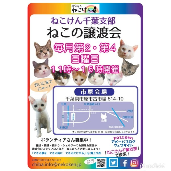 | イベント内容 | 千葉県の「殺処分0!野良猫0!」を目指し2018年7月に発足した「ねこけん千葉支部」の譲渡会です。 毎月第2・4日曜日の月2回開催!! 今月は1月12日と26日(日)です!! 初お目見えの仔猫も譲渡会デビューします♪※体調によりお休みの場合もあります。 ブログで見るあの子は?とお声をかけていただければご案内しますので、 是非会いに来てくださいね! ※ネット掲載されていない子猫ちゃん&成猫ちゃんも多数参加!!! 参加の猫ちゃんは、可能な限りブログで随時お知らせしていきます! ↓↓↓ https://ameblo.jp/nekoken-chiba/ また、譲渡会会場では、千葉県内にお住いの預かりボランティアさん及びお世話ボランティアさんを募集しています。 ご希望の方は、大変お手数をおかけしますが、譲渡会までお越しください。 ※ご都合がつかない場合は、お問い合わせ先までご相談ください。 [日時] 1月26日(日)11:00~15:00 [会場] 千葉県市原市古市場614-10 ※屋内での開催となり雨天決行です。 ※抱っこもOK! ※猫ちゃんの負担も考え、ご来場は時間内にお願い致します。 ※特にご予約などは必要ございませんのでご家族皆様でぜひお越し下さい。 ※駐車場あり。 [交通] 交通機関を利用してお越しの方 JR内房線 浜野駅より徒歩13分 浜野駅は、東京駅から京葉線→内房線でおよそ50分の距離!! お車でお越しの方 京葉道路蘇我インターより車で10分 ※駐車場はラジコンショップハッピー様裏手にございます駐車場をご利用ください [譲渡ご希望の方へのお願い] 誠に恐れ入りますが下記に当てはまります方への譲渡は不可となりますので予めご了承下さい。 ①学生さん、未成年の方、安定収入のない方 ②ペットを飼う事を許されていない住宅にお住まいの方 ③身体的、精神的疾病で治療中の方 ※60歳以上の方は別途条件がございますのでご相談下さい。 [譲渡の流れ] お申込み→審査→後日お届け→トライアル→正式譲渡 ※当日のお連れ帰りは出来ませんので予めご了承ください。 ※仮譲渡時にご希望の猫ちゃんにかかった医療費(血液検査・ワクチン・駆虫・不妊去勢手術等)をご負担願います。 しかし、正式譲渡に至らなかった場合は医療費を全額返済致します。 [主催] 動物愛護団体 NPO法人ねこけん 千葉支部 [ブログ] https://ameblo.jp/nekoken-chiba/ [参加動物] 成猫・子猫(ねこけん保護猫以外の猫ちゃんも参加予定です) [お問い合わせ] ご不明な点、ご質問等ございましたら下記までお問い合わせください。 chiba.info@nekoken.jp ※譲渡会へお越しの際、特に予約等必要ありません。 イベントのイメージ イベントのイメージ イベントのイメージ イベントのイメージ イベントのイメージ |