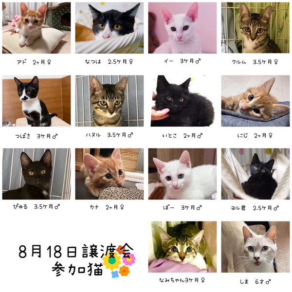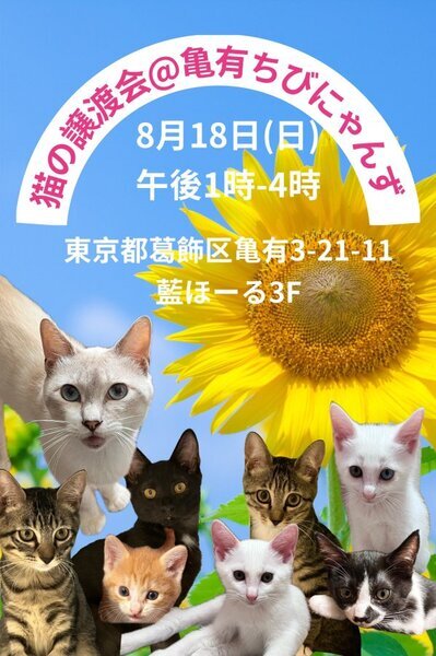 | イベント内容 | 【8月18日 葛飾区亀有室内譲渡会】 涼しい室内譲渡会に子猫さんたち、人にやさしいシニア猫さんたちが集まります。 お話をしながら、適した環境かを考え、双方納得しましたら トライアルにお届けにまいります。 ◆イベント名:猫の里親をさがす会 ◆日時:2024年8月18日(日) 13時~16時 ◆場所:葛飾区亀有 3-21-12 あいビル3F 藍ホール 見合いの条件】 1、病気や精神的な問題などがなく、健脚で健康な人であること 2、終生飼育するという責任あるお気持ちとその猫に合った飼育環境であること 3、完全室内飼いが終生でき 脱走防止対策ができること 4、猫の飼育可の住居にお住まい 5、他アンケートで詳しくお聞き致します。 (東京都葛飾区より10Km圏内の募集になります。) 【以下の方には譲渡しておりません。】 ・留守時間が長い方 ・猫の飼育が許可されていない住居にお住まいの方 ・友人同士、同棲、シェアハウス等 ・乳児のいるご世帯、未成年、学生 ・出産予定、引っ越し予定の方 ・脱走防止対策にご協力頂けない方 ・経済的に不安定な方(休職中、就職活動中、アルバイト、生活保護等)や経済的な余裕がない方 ・先住犬猫を多く飼育している方 ・先住犬猫が不妊手術していない方や動物病院へ行った事がない犬猫がいる方 ・譲渡後のご連絡が滞る方、譲渡人との信頼関係を築く事が難しいと判断した場合 ・住環境が飼育に適していない方 ◆当里親会は猫さんと里親様とのマッチングを大切にしています◆ はじめて猫さんをお迎えする場合に適した猫さん、お留守番の長い里親さんに適した猫さん等、 お迎えする不安など経験豊富なスタッフがお話を聞き、アドバイスさせていただいています。 【里親様へお願い】 ①終生飼育 ②完全室内飼育 ③不妊・去勢手術 ④譲渡負担金 ⑤契約書の署名捺印 ⑥定期報告義務 ⑦身分証の提示 をご了承ください。 猫の譲渡活動は里親様と保護主との信頼関係で成立いたします。 そうではない場合には譲渡をお断りする事があります。 猫の里親をさがす会 https://twitter.com/shosukereiko |