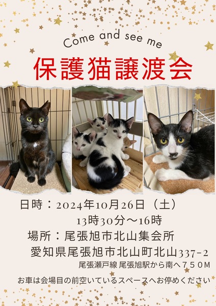 | イベント内容 | 保護猫譲渡会! 尾張旭市 北山集会所で初開催! 小さな子猫は もちろん可愛いですが 少し育った若猫、性格が安定した大人猫も ずっとのおうちを探しています。 譲渡会ってどんな感じなんだろう? どんな子がいるの? 見学も歓迎です♪ 個人保護主が集まって共同開催しております。 譲渡条件などは 個々の保護主よりますので 気になる猫さんがいましたら お気軽に保護主にお尋ね下さい。 (^-^) マスクの着用は個人の判断にお任せします。 希望者の方には アンケート記入をお願いしております。 アンケートを元に お話しをさせて頂きます。 当日 猫を連れて帰る事は出来ません。 お車でお越しの場合 北山集会所前に駐車スペースがございます。 路上駐車は 近隣住民のごさ迷惑になりますのでおやめください。 名鉄瀬戸線 尾張旭駅から南へ750m |