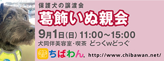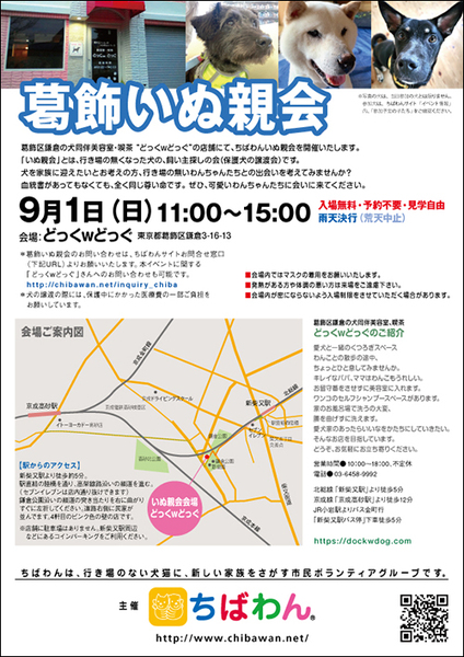 | イベント内容 | 葛飾区鎌倉のいぬ同伴美容室・喫茶“どっくwどっぐ”の店舗にていぬ親会を開催します。 可愛い保護わんこたちが新しい家族との出会いを求めて参加します!! いぬ親会見学は予約等必要ありません。 是非、ご家族同伴でご来場下さい。 【ちばわんからのお願い】 ◆会場内ではマスクの着用をお願いします。 ◆発熱がある方や体調が悪い方は来場をご遠慮ください。 ◆会場内が密にならないよう入場制限をさせていただく場合があります。 開催日:9月1日(日)11:00~15:00 室内開催 雨天決行 場所 :どっくwどっぐ 東京都葛飾区鎌倉3-16-13 【駅からのアクセス】 新柴又駅より徒歩約5分。 駅直結の陸橋を通り、高架線路沿いの細道を進みます。 (セブンイレブンは店内通り抜けできます) 鎌倉公園沿いの細道の突き当たりを右に曲がりすぐに左折してください。 道路右側に民家が並んでいます。4軒目のピンク色の壁の店です。 ※店舗に駐車場はありません。 当日お車の方はコインパーキングをご利用ください。 《注意事項》 【当日の流れ】 (1)家族募集中のいぬとお会いになりたい方はどなたでも自由にご参加いただくことができます。ちばわんボランティアは名札をつけておりますので、ご遠慮なくお声をかけて下さい。また、募集中のいぬのそばには預かりボランティアが控えておりますのでいぬの性格や生活習慣など、遠慮なくご質問ください。 (2)ご希望のいぬが決まったら、お申し込みアンケートにご記入の上、ボランティアにお渡し下さい(前日までにメールでアンケートを送信してお申し込みいただくこともできます。) ◆「いぬ」アンケート送信先:https://chibawan.net/contactform_dog (3)アンケート内容を拝見し、お話させていただきます。 (4)原則として一両日中にお返事の連絡をさせていただきます。 (5)ご縁が成立した場合には、後日、こちらからご自宅までいぬをお届けし、約1ヶ月のお試し生活に入っていただきます。お届けの際に、書面での譲渡契約書を交わします。 ※ワクチン・不妊手術代など保護犬にかかった費用は、家族になるいぬ親さんにもご負担をお願いしています。 《お知らせ》 会場ではチャリティグッズを販売します。 売上金は保護した犬猫の医療費など、 ちばわん活動費として大切に使わせていただきます。 いぬ親会について:https://chibawan.net/inquiry_dog_other ※いぬ親会当日はメールが見られません。また、お問い合わせの際は、必ず「具体的な件名」を入れて多数の迷惑メールと区別がつくようにお願いいたします。 いぬ親会ホームページ https://chibawan.net/event/20240901katsushika-dog ちばわんホームページ https://chibawan.net/ |