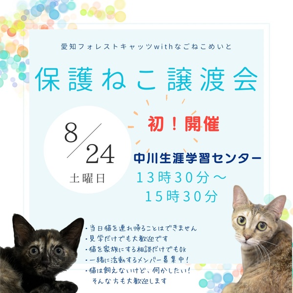 | イベント内容 | 日時 8月24日(土) 13時30分〜15時30分 場所 中川生涯学習センター 主催 愛知フォレストキャッツwithなごねこめいと 地域猫活動やTNR活動の過程などで 保護した猫たち 子猫もいれば、大人猫もいます 見学、相談だけでも大丈夫! 予約不要、参加費無料なのでお気軽に 猫に関する活動を何かしたい、という方も歓迎です 遊びに来る感覚で、お越しくださいませ ☆猫に関して☆ 各団体の保護主さんごとに決めているお約束事があります ・当日は猫を連れ帰ることはできません ・猫を迎えるにあたり、飼育環境などについて お話しをさせていただきトライアル(お試し飼育) から始めさせていただきます ・2週間前後のトライアル期間を経て、問題ない ようであれば、譲渡契約書を結び正式譲渡と なります ・所定の譲渡費用をいただきます |