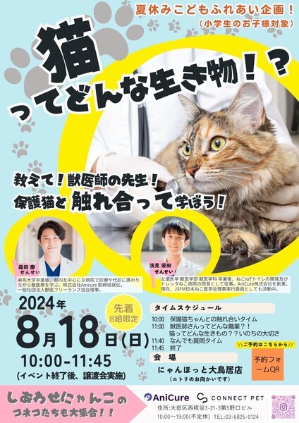 | イベント内容 | 「しあわせにゃんこ」は行き場のない猫ちゃんと里親様との 出逢いの場を提供するグループです♪ 子猫も成猫もハンデのある猫もみんな新しい家族を待っています♪ みなさまのご来場を保護主、スタッフ一同心よりお待ちしております♪ 詳しくはホームページ譲渡会情報をご確認願います。 http://www.shiawasenyanko.net 夏休み企画♪ ご家族皆様でにゃんことふれあい♪ にゃんこを迎える為の注意点を獣医師に聞ける♪ そしてプチ譲渡会も開催♪ ◆開催日/開催時間◆ 2024年8月18日(日) 13:00~16:00 ※先着順ではございません。 ※当日、猫ちゃんを連れて帰ることは出来ません。 後日調整のうえ保護主が里親様宅へお届けいたします。 ◆会場◆ 受付はまいの間1階です♪ ※お店の奥に会場への階段がございます♪ 譲渡会場:東京都大田区西糀谷3-21-4 第5野口ビル にゃんほっと大鳥居店 ※詳しいアクセスはホームページをご覧下さい http://www.shiawasenyanko.net ◆交通手段◆ 京浜急行電鉄空港線 「大鳥居」駅 徒歩3分 「糀谷」駅 徒歩5分 ※お車でご来場の際、駐車場のご用意はございません。 近隣のコインパーキング等をご利用ください。※近隣に沢山あります。 いつ里の掲載参加猫一覧はこちらから https://satoya-boshu.net/mypage/foster_list.php?@ps@=none アメーバブログの里親募集にゃんこはこちら https://ameblo.jp/shiawasenyan-ko/theme-10092719565.html ◆猫ちゃんとのお見合い◆ 掲載している猫ちゃんは基本的に譲渡会場でのお見合いのみとなります。 譲渡会への参加が決定している猫ちゃんはその譲渡会で里親様が決定しなかった場合のみ保護主宅でのお見合いが可能となります。 自宅お見合いを希望される里親様はメール(info@shiawasenyanko.net)にてご相談ください。 ◆当譲渡会では猫ちゃんと里親様のスキンシップを大切にしています◆ 新しい家族として20年以上いっしょに暮らしていく猫ちゃんです。 譲渡会場でたくさんの猫ちゃんと触れ合って良きパートナーを見つけてください。 はじめて猫ちゃんを迎える不安や先住猫ちゃんとのトライアルの注意点、猫ちゃんと里親様の暮らし方など気軽にご相談ください。 経験豊富な保護主や猫大好きスタッフがアドバイスさせていただきます。 ◆子猫ご希望の里親様◆ 子猫は急な下痢や発熱等により体調が急変し、数時間対応ができなかっただけでも命を落とす事があります。 その為、当譲渡会では月齢によりお留守番のない又は少ないご家庭への譲渡に限らせて頂いております。 また里親様と子猫ちゃんが安心してトライアル期間を過ごせるよう体重が1㎏程になってからのお届けとさせて頂いております。 ◆里親希望のみなさまへ◆ ご家族の皆様で生涯、家族の一員としてたっぷり愛情を注いでくださるご家庭をお待ちしております。 下記に該当する希望者様へ ・独身、単身者の方 ・友人同士、同棲でのお住まいの方 ・高齢者のみのご家庭の方 は、ご相談の上、譲渡を判断させて頂きます ・適正飼育の不可能な方 ・脱走防止対策を考えて頂けない方 ・定期報告の不可能な方 は、ご遠慮下さいますようお願い致します ◆ご負担頂く費用について◆ 譲渡の際に譲渡負担金(医療費の一部、譲渡金、お届け時の交通費)を里親様にご負担頂く事により 過酷な状況にいる猫ちゃんを保護し新しいご家族の元へ送り出す事ができています。 皆様のご理解とご協力にボランティア一同、心より感謝しております。 ご負担頂く医療費につきましてはホームページに詳しく記載させて頂いております。 http://www.shiawasenyanko.net/onegai.html しあわせにゃんこホームページ http://www.shiawasenyanko.net メールでのお問い合わせ info@shiawasenyanko.net |