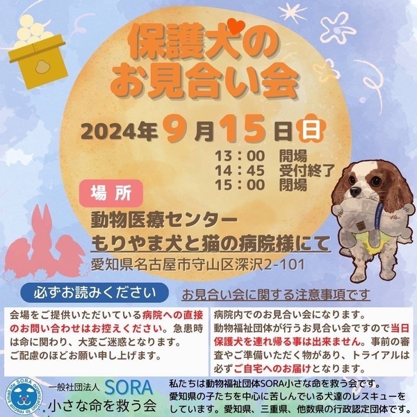 | イベント内容 | 保護犬のお見合い会を開催致します。 先住ワンちゃんを一緒にお連れの際は必ずマナーオムツ着用をお願いします。 マナーオムツの着用がない場合は、その場でマナーオムツをご購入頂くか、もしくは、ご入場をお断りすることがあります。ご了承下さい。 【注意】会場をご提供頂いている病院への直接のお問い合わせはお控えください。急患時は命に関わり、大変ご迷惑となります。ご配慮のほどお願い申し上げます。 もりやま犬と猫の病院さま2階会議室 〒463-0811名古屋市守山区深沢2-101 <ご注意>事前のお申込みは不要です。保護活動ブログで、開催日の数日前に譲渡会参加が決定したワンコたちのご案内もしておりますので、ご希望のワンコの参加をご確認してお越し頂けますと幸いです。 SORA公式ホームページhttps://sora-chiisana.org/foster/ SORA公式活動メインブログhttps://ameblo.jp/sora-chisana-inochi/ SORAイベントブログhttps://ameblo.jp/sora-charity-events/ |