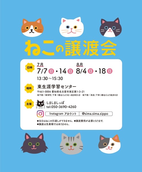 かわいいねこ達をご家族に迎えたい方・ボランティアに興味がある方・ねこのことでご相談のある方など、皆様のお越しをお待ちしています。 会場にはふれあいスペースも設けてありますので気になる子としっかり触れ合ってみてくださいね♪ 参加予定のメンバー・里親募集中のねこ達の普段の様子はインスタグラムでご覧いただけます。 会場にはねこと一緒に遊んだり抱っこできるフリースペース(テント内)もあります。 ねこをお迎えしたい方はもちろん、まずは見学や触れ合ってみたいみなさまもお気軽にお越しください。 各種ボランティアさんも募集していますので、興味のある方はぜひご来場・お問い合わせください。 |
