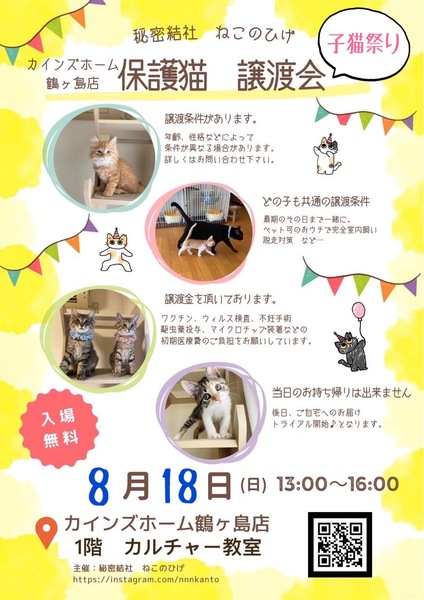 | イベント内容 | 【秘密結社ねこのひげ♡保護猫譲渡会】 8/18(日) 13:00~16:00 埼玉県鶴ヶ島市三ツ木新町1-1-13 カインズホーム鶴ヶ島店1F カルチャー教室 にて保護猫譲渡会を初開催します☆ 純血種多頭遺棄現場より またあらたにレスキューとなった仔や 今春~夏生まれの仔猫たちが 元気いっぱいで参加します♪ ずっとのご家族さまと 愛し愛されな 両想いになれますように♡ 家族にするなら保護猫だべ♪♪ 新しい家族と笑顔で暮らしたい♪ という方は是非会いにいらしてください♡ ご不明な点がございましたら Instagram @nnnkanto DMにてお問い合わせ下さい☆ |