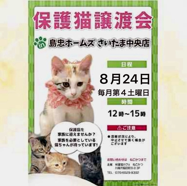 | イベント内容 | *保護猫讓渡会* 日時:8/24(土)12時~15時 場所:ホームズさいたま中央店さま 島忠ホームズさいたま中央店さま譲渡会に参加予定です。 センターからの引き出し、飼育崩壊や所有権放棄などで、生きる場所を失った猫たちが、最大限の医療にかけてピカピカになりました。 写真の猫の他にも甘えっこちゃんたちが、溢れる笑顔でお待ちしています。 ぜひご参加ください。 ***譲渡条件*** *完全室内でお願いします。 *逸走防止対策にご協力頂ける方 *写真付きの身分証をご提示頂ける方 *LINE若しくはメールでのやりとりが可能な方 *譲渡に関する覚え書きにご署名頂ける方 *初期医療費をご負担頂ける方 *その他の譲渡条件を、譲渡会場でお話させて頂ける方 *猫が生まれた年から20年後に、80歳を超えていない方 *お一人暮らしの方は、後見人さまのご同席が必要です。 |