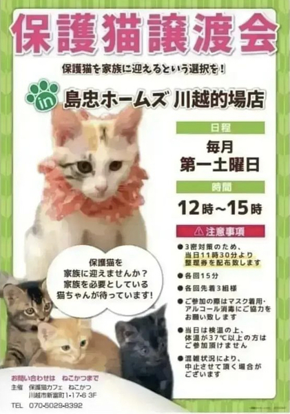 | イベント内容 | 保護猫カフェねこかつさん主催の保護猫譲渡会です☺︎ ねこかつさんや個人ボランティアさんの元で大切にお世話された、ちびっ子や大人猫ちゃんがたくさん参加しますʚ₍ᐞ·͈༝·͈ᐞ₎ɞ どなた様もご自由にご参加いただけます*♪ ❁譲渡には譲渡条件がございます ❁お申込みの際にはアンケートへのご記入がございます ❁当日に猫ちゃんを連れて帰ることはできません |