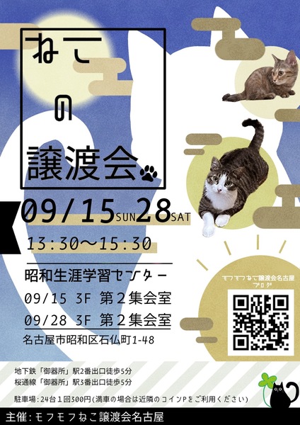 | イベント内容 | モフモフねこ譲渡会名古屋 猫たちの幸せなお家探しのために譲渡会を開催しております。 個人ボランティアの集まりです。 自分たちの出来ることから頑張っております! 一匹でも幸せになれる猫が増えますように 場所 昭和生涯学習センター 第2集会室 住所 名古屋市昭和区石仏町1-48 時間 13時30分~15時30分 交通機関等 地下鉄「御器所」鶴舞線2番出口南約300m 桜通線3番出口南東約300m 駐車場24台(満車の場合は近隣コインPをご利用ください) 参加猫の情報は下記モフモフねこ譲渡会名古屋ブログにてご確認ください。 https://mofumofuneko4.fc2.net/ 【譲渡会について】 ・譲渡会は入場無料、予約不要です。お気軽にご参加ください。 ・会場へのお問い合わせはご遠慮ください。 ご質問は下記メールアドレスへお願いいたします。 mofumofuneko4☆gmail.com ☆を@に変更してお問い合わせください。 ・猫の引き取りはしておりません。 ・譲渡会当日に猫をお渡しすることはありません。 ・保護主によって譲渡条件が違う場合があります。 ・参加予定でも譲渡会前にトライアルになる場合があります。 ご希望の猫がいましたらまずはお問い合わせをお願いいたします。 【参加猫について】 ・ノミ駆除、駆虫、トイレ躾、ワクチン3種接種済。 ・年齢や健康状態に応じて、避妊手術を行っております。 ・参加予定で紹介していても当日体調不良等で欠席になる場合があります。 【譲渡の約束事】 ・ペット飼育可の住宅にお住まいの方。 ・完全室内飼育。 ・脱走防止の対策をしていただける方。 ・避妊手術未実施の場合、避妊手術 の実施と報告をしていただける方。 ・ご家族全員が猫を飼うことに同意していること。 ・譲渡後、しばらく定期連絡を入れていただける方。 *お一人暮らしの方、60歳以上の方は、身内の方の保証が必要となる場合がございます。 #名古屋昭和区 #昭和生涯学習センター #譲渡会 #保護猫 #地域猫 #さくらねこ #tnr #里親募集 #里親募集中 #猫 #ねこ #殺処分ゼロ #買わずに飼おう #モフモフねこ譲渡会名古屋 #ペットショップに行く前に #譲渡会のお知らせ #猫と暮らしたい |