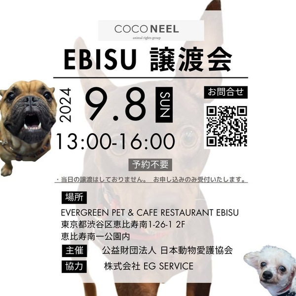 | イベント内容 | COCO NEEL EBISU譲渡会 2024.9.4(日)13:00〜 16:00 (予約不要) ━━━━━━━━━━━━━━━ ?会場 東京都渋谷区恵比寿南1-26-1 2F EVERGREEN PET & CAFE RESTAURANT EBISU ?️の用意はありません? 近隣のコインパーキングのご利用をお願いいたします。 ????JR山手線「恵比寿駅」東口徒歩5分 【恵比寿南一公園内】 ━━━━━━━━━━━━━━━ 会場にてお見合いをご希望の方は、譲渡条件をよくご確認のうえ、里親希望エントリーフォームより事前エントリーお願いします。 詳細はHP、ブログからご確認ください。 ━━━━━━━━━━━━━━━ ?COCO NEELオリジナル チャリティーTシャツを譲渡会特別価格にて販売します! ※売上は保護っ子達の医療費・活動費として大切にお預かりさせていただきます?♀️ ━━━━━━━━━━━━━━━ ⚠お願い⚠ ・ワンコ連れの方は必ずマナーウェアの着用をお願いします。 |