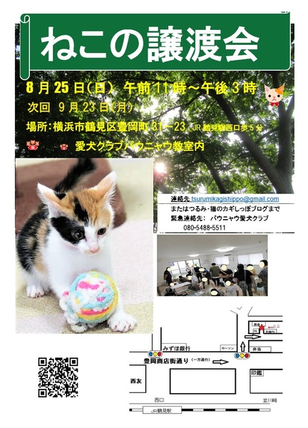 | イベント内容 | つるみ・猫のカギしっぽ譲渡会vol.61 日時: 8月 25日 (日) 午前11時~午後3時 場所: 横浜市鶴見区豊岡町31-23 愛犬クラブ バウニャウ教室内 JR鶴見駅西口より 徒歩5分) 参加猫一覧はこちら http://tsurumineko.blog9.fc2.com/blog-entry-2151.html 空調の利いた室内での譲渡会です(雨天でも開催)。 フリーになっている猫もいます、 猫を触る際は必ずスタッフの指示に従ってください。 お見合いをご希望の際にはアンケート用紙に 環境(住宅・家族構成・住所etc)をご記入いただいています。 譲渡条件・譲渡費用については、予めこちらをご覧ください ⇒ 猫の譲渡について *子猫については長時間のお留守番のないご家庭を探しています *個人保護者の保護猫に関しては 会とは譲渡条件が異なる場合があります、 それぞれの猫の紹介記事に譲渡条件、費用等について 併記しておりますので、ご覧ください。 当日のお届けはしておりません。 後日、住所・ご家族様の同意などの確認のためご自宅までお届けいたします。 トライアル時書類をご記入いただきます。 *譲渡会前にお話の進む場合もあります、 気になる子がいらした方は事前にお問い合わせをお願いいたします。 連絡先⇒ tsurumikagishippo@gmail.com または当ブログコメントまで |