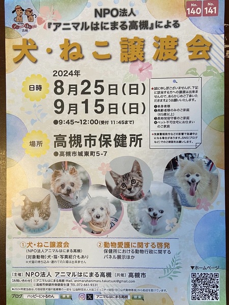 | イベント内容 | 高槻市保健所でほぼ月に1回 譲渡会を開催しています エントリー犬・猫 犬さん チワワコットン・トイプーれん・ヨーキーポアロ・ポメりぼん ねこさんは メッシー・ミケ・まる・たま・クリ・未来・ナイト・仔猫 他 写真参加も居ます 詳しくは・・ インスタグラム「アニマルはにまる高槻」 X(旧ツイッター)「アニマルはにまる高槻」 HP「アニマルはにまる高槻」 ブログ「ハッピーにゃるわん」 をご覧ください<(_ _)> 当日の体調やご機嫌により エントリー犬猫さんが変更する場合がございます ご理解ください<(_ _)> 皆でドキドキワクワクお待ちしています! |
