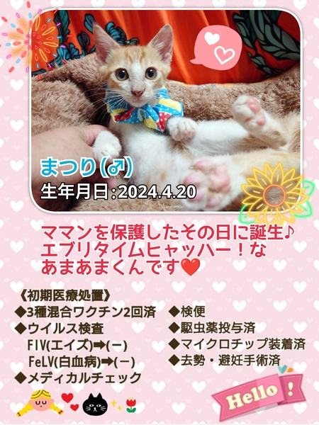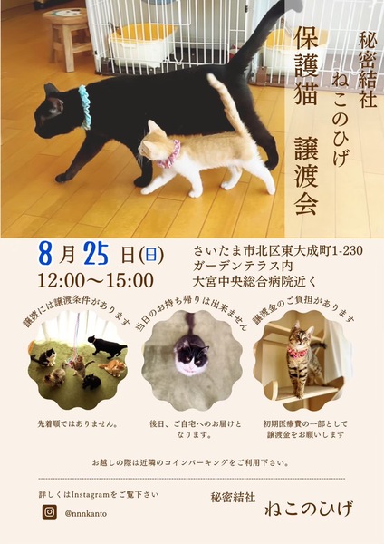 | イベント内容 | 【秘密結社ねこのひげ♡保護猫譲渡会】 8/25(日) 12:00~15:00 さいたま市北区東大成町1-230 金子建材内 ガーデンテラスにて 保護猫譲渡会を開催します☆ 仔猫祭継続中のため ちびっ子ギャングたちが集結します♪ また、 小童には負けへんでー! な魅惑的なモフモフオトナ猫も♪ 10数頭が参加予定です♪ 未来のご家族さまと 愛し愛されな 両想いになれますように♡ 家族にするなら保護猫だべ♪♪ こんなご時世だけど 新しい家族と笑顔で暮らしたい♪ という方は是非会いにいらしてください♡ ご不明な点がございましたら インスタグラム @秘密結社ねこのひげ の DMまでお問い合わせ下さい☆ |