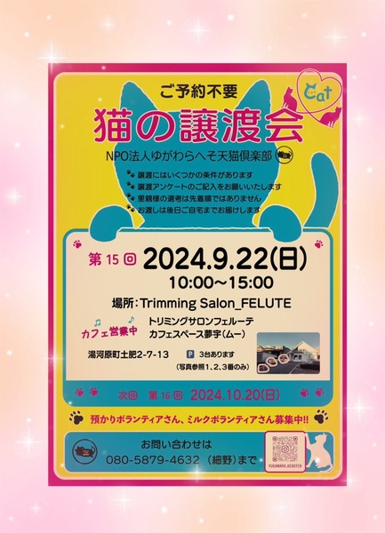 | イベント内容 | 神奈川県湯河原駅より徒歩5分 海に向かって歩いた郵便局の裏側辺りで開催です。 可愛い子猫、成猫が参加します。 ベテランスタッフ、預かりスタッフからゆっくり日々の様子を聞いてご家族に合うこを探していただけますよ |