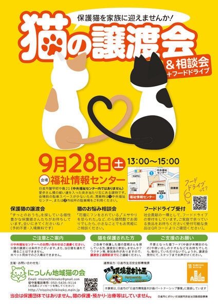 | イベント内容 | 9月28日(土)に「猫の譲渡会&相談会」を開催いたします。 保護猫を迎えたい方はもちろん、猫に関する相談会も同時開催しております。 ご近所との猫トラブルなどでお悩みの方も、どうぞお気軽にお立ち寄りください。 地域貢献の一環として、フードドライブの受付もしております。 ご家庭や職場で余っている食品がありましたらぜひお持ちください! 小さな譲渡会ですが、猫さんも人間も良いご縁を紡げられるよう、のんびり続けています。 遊びにきてくださいね(*^^*) 【日時】9月28日(土)13:00〜15:00 【会場】福祉情報センター ★★★ご注意★★★ 会場は「中央福祉センター」の中ではありません。 その隣の奥まったところにある「福祉情報センター」という小さな建物で開催しております。 お手数ですが、チラシやホームページの地図をご確認の上お越しください。 ★★★★★★★★★ 【入場無料・予約不要】 【主催】にっしん地域猫の会 【ホームページ】https://nissinchiikineko.main.jp ※会場前に駐車場がございますが、数が少ないため、満車時は中央福祉センターの駐車場をご利用ください。図書館のむかいにある市役所の臨時駐車場もご利用いただけます。 ※室内換気のため冷暖房が効きにくい場合がございます。 ※ペット同伴のご入場はできません。 ※猫ちゃんの譲渡には条件がございます。詳細はホームページをご参照ください。 |