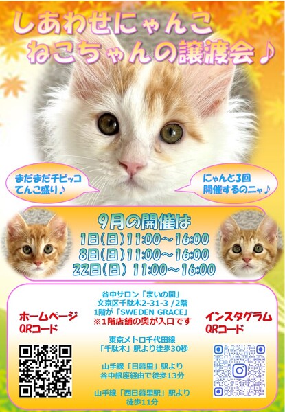 | イベント内容 | 「しあわせにゃんこ」は行き場のない猫ちゃんと里親様との 出逢いの場を提供するグループです♪ 子猫も成猫もハンデのある猫もみんな新しい家族を待っています♪ みなさまのご来場を保護主、スタッフ一同心よりお待ちしております♪ 詳しくはホームページ譲渡会情報をご確認願います。 http://www.shiawasenyanko.net まだまだチビッコてんこ盛り! お留守番可能なコからちんまり可愛いコまで 盛りだくさんで皆様をお迎えします♪ ◆開催日/開催時間◆ 2024年9月22日(日) 11:00~16:00 ご希望の猫ちゃんがいらっしゃる場合は11時30分までに受付をお願い致します。 複数のお申し込みがある場合は11時30分で受付を終了させて頂く場合がございます。 受付をされた全ての里親様とお見合いをさせて頂きます。 ※先着順ではございません。 ※当日、猫ちゃんを連れて帰ることは出来ません。 後日調整のうえ保護主が里親様宅へお届けいたします。 ◆会場◆ 受付はまいの間1階です♪ ※お店の奥に会場への階段がございます♪ 譲渡会場:東京都文京区千駄木2-31-3 1階が北欧雑貨ショップ「SWEDENGRACE」 2階が谷中サロン「まいの間」 ※詳しいアクセスはホームページをご覧下さい http://www.shiawasenyanko.net 谷中サロン「まいの間」の情報はこちら http://neko-to-kyo.com/#maima ◆交通手段◆ 東京メトロ千代田線「千駄木」駅より徒30秒 JR山手線「西日暮里」駅より徒歩11分 JR山手線「日暮里」駅より谷中銀座経由で徒歩13分 ※お車でご来場の際、駐車場のご用意はございません。 近隣のコインパーキング等をご利用ください。※近隣に沢山あります。 いつ里の掲載参加猫一覧はこちらから https://satoya-boshu.net/mypage/foster_list.php?@ps@=none アメーバブログの里親募集にゃんこはこちら https://ameblo.jp/shiawasenyan-ko/theme-10092719565.html ◆猫ちゃんとのお見合い◆ 掲載している猫ちゃんは基本的に譲渡会場でのお見合いのみとなります。 譲渡会への参加が決定している猫ちゃんはその譲渡会で里親様が決定しなかった場合のみ保護主宅でのお見合いが可能となります。 自宅お見合いを希望される里親様はメール(info@shiawasenyanko.net)にてご相談ください。 ◆当譲渡会では猫ちゃんと里親様のスキンシップを大切にしています◆ 新しい家族として20年以上いっしょに暮らしていく猫ちゃんです。 譲渡会場でたくさんの猫ちゃんと触れ合って良きパートナーを見つけてください。 はじめて猫ちゃんを迎える不安や先住猫ちゃんとのトライアルの注意点、猫ちゃんと里親様の暮らし方など気軽にご相談ください。 経験豊富な保護主や猫大好きスタッフがアドバイスさせていただきます。 ◆子猫ご希望の里親様◆ 子猫は急な下痢や発熱等により体調が急変し、数時間対応ができなかっただけでも命を落とす事があります。 その為、当譲渡会では月齢によりお留守番のない又は少ないご家庭への譲渡に限らせて頂いております。 また里親様と子猫ちゃんが安心してトライアル期間を過ごせるよう体重が1㎏程になってからのお届けとさせて頂いております。 ◆里親希望のみなさまへ◆ ご家族の皆様で生涯、家族の一員としてたっぷり愛情を注いでくださるご家庭をお待ちしております。 下記に該当する希望者様へ ・独身、単身者の方 ・友人同士、同棲でのお住まいの方 ・高齢者のみのご家庭の方 は、ご相談の上、譲渡を判断させて頂きます ・適正飼育の不可能な方 ・脱走防止対策を考えて頂けない方 ・定期報告の不可能な方 は、ご遠慮下さいますようお願い致します ◆ご負担頂く費用について◆ 譲渡の際に譲渡負担金(医療費の一部、譲渡金、お届け時の交通費)を里親様にご負担頂く事により 過酷な状況にいる猫ちゃんを保護し新しいご家族の元へ送り出す事ができています。 皆様のご理解とご協力にボランティア一同、心より感謝しております。 ご負担頂く医療費につきましてはホームページに詳しく記載させて頂いております。 http://www.shiawasenyanko.net/onegai.html しあわせにゃんこホームページ http://www.shiawasenyanko.net メールでのお問い合わせ info@shiawasenyanko.net |