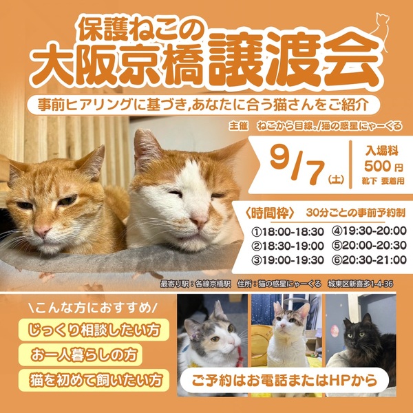 | イベント内容 | 【ねこと遊べる譲渡会!】 猫カフェで遊びながら!! 家族を決めませんか?? 大阪京橋駅徒歩6分の場所にて 土曜日の夜18時〜21時まで 30分毎、完全予約制の譲渡会です。 家族を決める大事な時間なので ゆっくり相談しながら 家族になる猫ちゃんを決めていただけます✨️ 子猫さんからシニア猫さんまで 15匹以上の猫が参加予定です☆ もちろんおひとり様からご予約可能です?♀️ 場所:猫カフェ 猫の惑星にゃーくる (大阪府大阪市城東区新喜多1-4-36) 時間: ①18:00~18:30 ②18:30~19:00 ③19:00~19:30 ④19:30~20:00 ⑤20:00~20:30 ⑥20:30~21:00 入場料:1人500円(未就学児は無料) 主催:ねこから目線。 猫の惑星にゃーくる ホームページに詳細を記載しております。 https://www.nyacle.com/joutokai 参加猫情報は Twitter、Instagram各種SNSで 情報発信中です! 猫の惑星にゃーくると検索してください。 お問い合わせ、ご予約は 公式LINEか各種SNSのDMからどうぞ! https://lin.ee/QvoeCQI お電話でも予約できます?♀️ 06-4400-0622 —————– ※靴下着用です。 ※駐車場はございません。近くのパーキングをご利用ください。 ※当日の猫を連れて帰ることはできません。 |