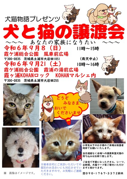 | イベント内容 | 毎月第二日曜日に土浦市の霞ヶ浦総合公園で開催しています、 犬と猫の譲渡会です。 毎回、色んなところからの家族を探す犬猫が参加します。 あなたとの出会いを待つワンニャンにぜひ会いにきてくださいませ。 11時~15時開催です ●犬猫物語は土浦を中心とし保護活動、野良猫の避妊去勢などを行っている団体です。 犬猫の相談などはお電話くださいませ。 譲渡会への猫の参加も受け付けております。 当日いきなりの参加は不可能ですが、事前にご連絡ください。 お待ちしています(^^ 問い合わせは09017673372鈴木まで。非通知には出ません。 |