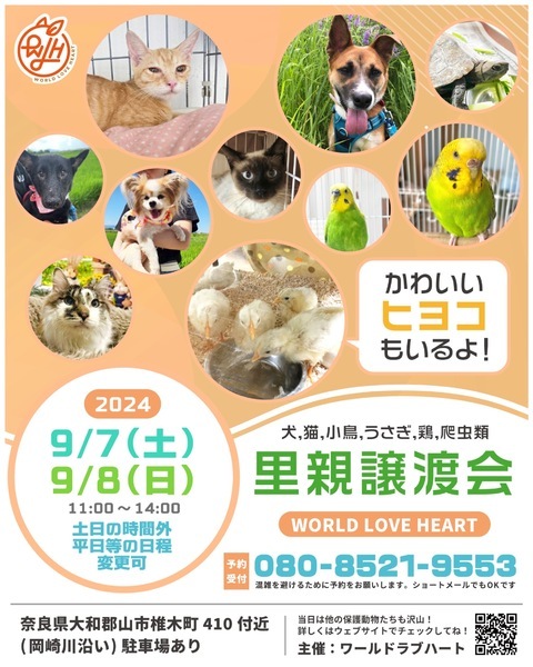 | イベント内容 | ワールドラブハートで里親募集中の動物たちの譲渡会を開催します! 犬猫だけではなく、インコやウサギ、チンチラに亀などたくさんの保護動物がいます! みんな新しい家族を探しています。写真だけでは伝えきれない魅力が盛りだくさん! 実際に会ってそのかわいさを実感してください♪ ★里親募集中の動物たち★ https://satoya-boshu.net/foster/?@button_name@=search&FosterParent_MemberID=1161 ・ヒヨコ←たくさんいます! ・犬、猫 ・インコ ・ウサギ ・チンチラ ・ハムスター ・小鳥 ・チャボ ・カメ ……など 子犬や子猫もたくさんいますよ♡ ぜひお気軽にお越しください! ●混雑をさけるために、事前予約をお願いします。 予約番号080-8521-9553 ショートメールでも可♪ ●当日までに譲渡が決定した・体調がすぐれないなど、やむを得ない理由で不参加の場合があります。ご希望の子がいましたら、当日お問い合わせください。 ●当日、その場での引き渡しはしておりません。譲渡決定後、自宅訪問を兼ねてこちらからお届け致します。 ご来場お待ちしております♪ ★world love heart(ワールドラブハート)は、奈良県大和郡山市で活動している動物保護団体です。 『引き取り依頼は断らない』をモットーに、犬、猫、鶏、小動物、家畜、爬虫類など捨てられた動物を保護しています。 https://worldloveheart-nara.jimdofree.com |