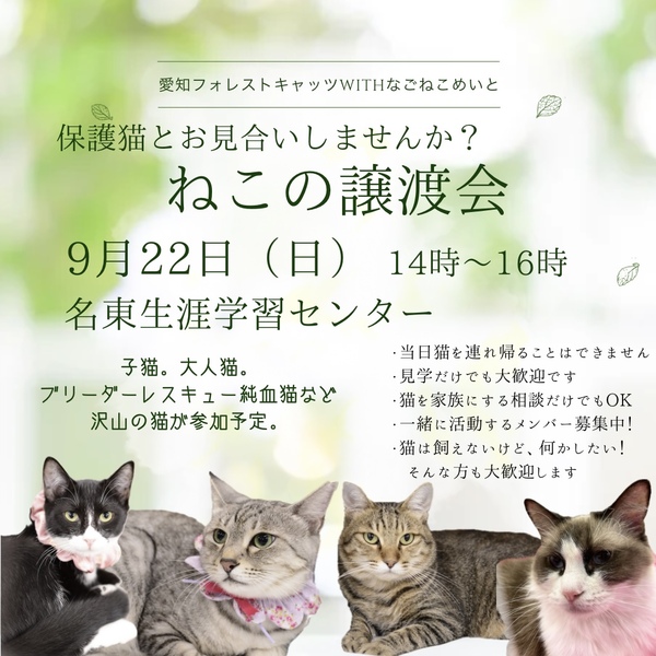 | イベント内容 | 日時 9月22日(日) 14時〜16時 場所 名東生涯学習センター 主催 愛知フォレストキャッツwithなごねこめいと 地域猫活動やTNR活動の過程などで 保護した猫たち 子猫もいれば、大人猫もいます 見学、相談だけでも大丈夫! 予約不要、参加費無料なのでお気軽に 猫に関する活動を何かしたい、という方も歓迎です 遊びに来る感覚で、お越しくださいませ ☆猫に関して☆ 各団体の保護主さんごとに決めているお約束事があります ・当日は猫を連れ帰ることはできません ・猫を迎えるにあたり、飼育環境などについて お話しをさせていただきトライアル(お試し飼育) から始めさせていただきます ・2週間前後のトライアル期間を経て、問題ない ようであれば、譲渡契約書を結び正式譲渡と なります ・所定の譲渡費用をいただきます |