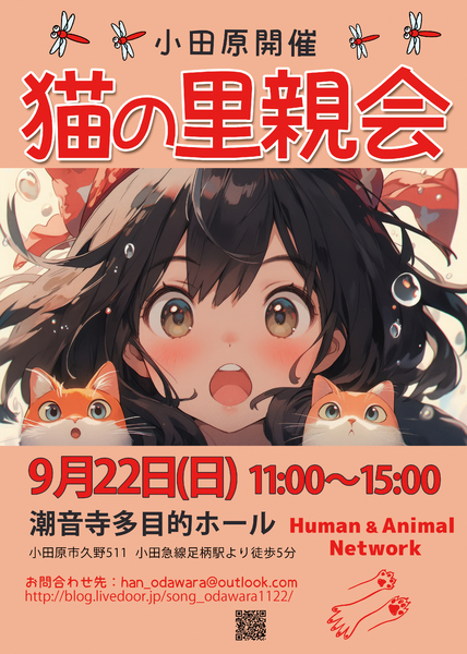 | イベント内容 | 神奈川県西湘地域で保護された猫たちの里親会です。畳のホールでのんびりお過ごしください。 会場:潮音寺 多目的ホール 日時:2024年9月22日(日)11:00~15:00 神奈川県小田原市久野511 小田急線足柄駅より徒歩6分 駐車場有(無料) 参照URL http://blog.livedoor.jp/song_odawara1122/archives/61801502.html ※注意※ ナビ検索では 小田原市久野507(潤生園やすらぎの家足柄)で検索してください。 小田原市久野511 で検索すると迷子になります! □■□里親さんになるための条件■□■ 1.終生愛情をもって飼育すること 2.完全室内飼い必須 3.ペット飼育可物件であること 4.脱走防止&名札の装着を徹底できること 5.猫を迎える事に家族全員の同意があること 6.譲渡後の定期報告ができること 7.ご家族に猫アレルギーの方がいないこと 8.単身者のご応募は保証人(非常時に飼育対応をしてくれる人)が居ること 9.ワクチン接種と傷病時の適切な治療ができること 10.万が一 猫が脱走した場合は適切な対応ができること 11.医療費と譲渡時の交通費を負担して頂けること 12.ペットを飼育できる十分な収入と時間があること 13.身分証明を提示できること 14.自宅への訪問が可能であること 15.譲渡誓約書の内容を十分理解し、譲渡後も誓約内容を継続的に守って頂けること 16.譲渡が決定した場合、譲受者一部負担金にご協力頂けること |