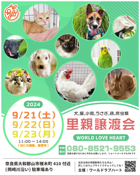 | イベント内容 | ワールドラブハートで里親募集中の動物たちの譲渡会を開催します! 犬猫だけではなく、インコやウサギ、チンチラに亀などたくさんの保護動物がいます! みんな新しい家族を探しています。写真だけでは伝えきれない魅力が盛りだくさん! 実際に会ってそのかわいさを実感してください♪ ★里親募集中の動物たち★ https://satoya-boshu.net/foster/?@button_name@=search&FosterParent_MemberID=1161 ★里親募集中の動物たち★ ・犬、猫 ・インコ ・ウサギ ・チンチラ ・ハムスター ・小鳥 ・チャボ ・カメ ……など 子犬や子猫もたくさんいますよ♡ ぜひお気軽にお越しください! ●混雑をさけるために、事前予約をお願いします。 予約番号080-8521-9553 ショートメールでも可♪ ●当日までに譲渡が決定した・体調がすぐれないなど、やむを得ない理由で不参加の場合があります。ご希望の子がいましたら、当日お問い合わせください。 ●当日、その場での引き渡しはしておりません。譲渡決定後、自宅訪問を兼ねてこちらからお届け致します。 ご来場お待ちしております♪ ★world love heart(ワールドラブハート)は、奈良県大和郡山市で活動している動物保護団体です。 『引き取り依頼は断らない』をモットーに、犬、猫、鶏、小動物、家畜、爬虫類など捨てられた動物を保護しています。 https://worldloveheart-nara.jimdofree.com |