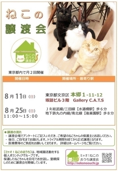 | イベント内容 | 参加する保護猫ちゃんについては、譲渡会一週間前からホームページhttp://nekonoouchi.jp/にてご紹介しております。 事前予約はできません。譲渡会場でお会いしましょう。 ※お問い合わせはホームページ内の【お問い合わせ】からお願い致します。保護主は日々、猫ちゃんのお世話と仕事に忙しくしておりますので、お返事に数日頂くこともございます。ご了承ください。 譲渡会場では、入口で簡単なアンケートにお答えいただきます。 気になる猫ちゃんがいたらスタッフにお声がけください。 面談後、双方に不安がないようでしたら、トライアル開始日をご相談させていただきます。 譲渡会当日に猫ちゃんを連れて帰ることはできません。 トライアル開始日にご自宅にお届けします。 トライアル期間を経て問題がないようでしたら、譲渡成立となります。 詳細は、ホームページ【譲渡の流れ】ページでご確認いただけます。 ◇譲渡に関するお願い 【ミャオ!ねこのおうち譲渡会】では、以下のお約束をお願いしております。 ・完全室内飼いで終生愛育 ・脱走させないための対策 ・不妊去勢手術 ・譲渡誓約書の取り交わし ・医療費の一部ご負担 ・記念の写真撮影 ・原則として、譲渡時に60歳未満の方 その他、ひとり住まいで緊急時の対応に困難な方や、経済的に困難な世帯、必要な脱走対策を施していただけない場合はご遠慮頂いております。 また、保護主により譲渡条件が異なる場合もございますので、会場で十分にご相談ください。 譲渡までの流れ、譲渡時のお願い、医療費の一部ご負担などは、ホームページでご確認いただけます。 ※お問い合わせは、ホームページ内の【お問い合わせ】からお願い致します。お返事に数日頂くこともございますが、ご了承ください。 |