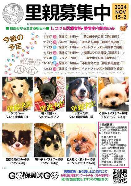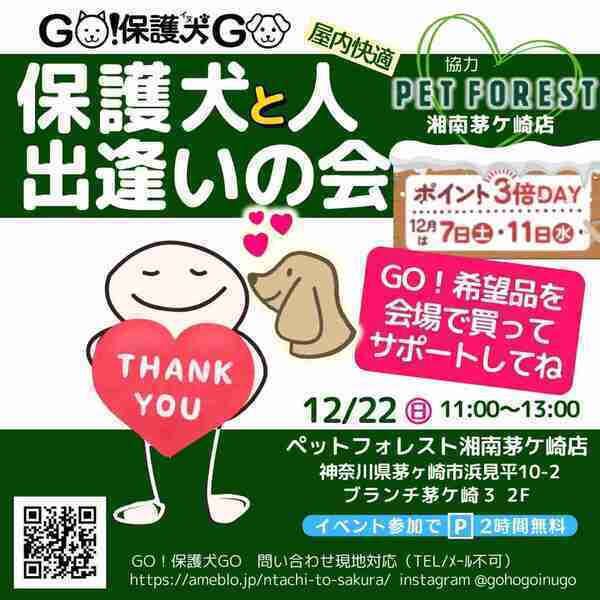 | イベント内容 | 『病院で褒められた』『迎えた翌日旅行へ行けるなんて』『やることがない』感動の声続々。 保健所、殺処分場、山で生まれ育った子、廃業ブリーダーで他が引き取らず現場に取り残されていた犬達は、本当に死んだ方が良い子達だったでしょうか? ご自分の目で確かめたものが真実です。 茅ケ崎のブランチ茅ケ崎3 2階 ペットフォレスト湘南茅ケ崎店にお越しくださいませ。 12月22日(日)11~13時 会場でGO!保護犬GOほしい支援品を展示販売しております。 お買い求めの上会場入りにご協力ください。 お一人500円(募金箱へ入れます)歓迎 いずれもない方は、5分のみドッグランへ入場が可能です この12月のみで29頭の犬を保護しております。何もなければ医療費290万円を試算しています。 無償のふれあい動物園ではありません。犬との幸せをつかみたい方がお越しになります。ご協力お願いいたします。 日頃の活動はブログにて GO!保護犬GO https://ameblo.jp/ntachi-to-sakura/ インスタグラム @gohogoinugo |