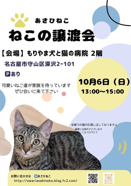 | イベント内容 | 行政機関(保健所・動物愛護センター)から引き取った猫や、地域猫活動中に保護した猫達に家族を探しています (=゚ω゚=) ♡猫を初めて迎えてみたい ♡運命の猫ちゃんと出会いたい ♡先住猫ちゃんの仲間探し 皆様のご来場をお待ちしております! 10月6日(日) 13:00〜15:00 ※毎月第1日曜日 会場 もりやま犬と猫の病院 2F 愛知県名古屋市守山区深沢2-101 駐車場あり ※病院へのお問い合わせはご遠慮下さい お問い合わせはコチラ ma47m@yahoo.co.jp ┈┈┈┈┈┈┈┈┈┈ ◎全頭ワクチン接種、ウイルス(FIV、FeLV)検査、マイクロチップ装着済み ◎譲渡には条件がございます 詳しくは下記ブログをご覧ください ↓↓↓ 主催者【あさひねこ】ブログ http://owariasahineko.blog.fc2.com/ |