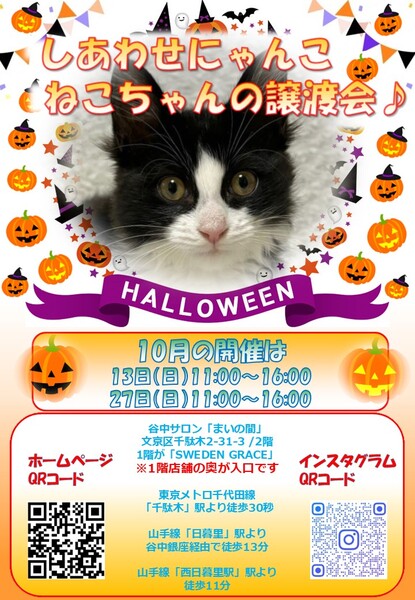 | イベント内容 | 「しあわせにゃんこ」は行き場のない猫ちゃんと里親様との 出逢いの場を提供するグループです♪ 子猫も成猫もハンデのある猫もみんな新しい家族を待っています♪ みなさまのご来場を保護主、スタッフ一同心よりお待ちしております♪ 詳しくはホームページ譲渡会情報をご確認願います。 http://www.shiawasenyanko.net 秋も深まりつつある10月といえばハロウィン♪ ハロウィンといえばにゃんこ! にゃんこといえばハロウィン! お留守番可能なコからちんまり可愛いコまで 盛りだくさんで皆様をお迎えします♪ ◆開催日/開催時間◆ 2024年10月13日(日) 11:00~16:00 ご希望の猫ちゃんがいらっしゃる場合は11時30分までに受付をお願い致します。 複数のお申し込みがある場合は11時30分で受付を終了させて頂く場合がございます。 受付をされた全ての里親様とお見合いをさせて頂きます。 ※先着順ではございません。 ※当日、猫ちゃんを連れて帰ることは出来ません。 後日調整のうえ保護主が里親様宅へお届けいたします。 ◆会場◆ 受付はまいの間1階です♪ ※お店の奥に会場への階段がございます♪ 譲渡会場:東京都文京区千駄木2-31-3 1階が北欧雑貨ショップ「SWEDENGRACE」 2階が谷中サロン「まいの間」 ※詳しいアクセスはホームページをご覧下さい http://www.shiawasenyanko.net 谷中サロン「まいの間」の情報はこちら http://neko-to-kyo.com/#maima ◆交通手段◆ 東京メトロ千代田線「千駄木」駅より徒30秒 JR山手線「西日暮里」駅より徒歩11分 JR山手線「日暮里」駅より谷中銀座経由で徒歩13分 ※お車でご来場の際、駐車場のご用意はございません。 近隣のコインパーキング等をご利用ください。※近隣に沢山あります。 いつ里の掲載参加猫一覧はこちらから https://satoya-boshu.net/mypage/foster_list.php?@ps@=none アメーバブログの里親募集にゃんこはこちら https://ameblo.jp/shiawasenyan-ko/theme-10092719565.html ◆猫ちゃんとのお見合い◆ 掲載している猫ちゃんは基本的に譲渡会場でのお見合いのみとなります。 譲渡会への参加が決定している猫ちゃんはその譲渡会で里親様が決定しなかった場合のみ保護主宅でのお見合いが可能となります。 自宅お見合いを希望される里親様はメール(info@shiawasenyanko.net)にてご相談ください。 ◆当譲渡会では猫ちゃんと里親様のスキンシップを大切にしています◆ 新しい家族として20年以上いっしょに暮らしていく猫ちゃんです。 譲渡会場でたくさんの猫ちゃんと触れ合って良きパートナーを見つけてください。 はじめて猫ちゃんを迎える不安や先住猫ちゃんとのトライアルの注意点、猫ちゃんと里親様の暮らし方など気軽にご相談ください。 経験豊富な保護主や猫大好きスタッフがアドバイスさせていただきます。 ◆子猫ご希望の里親様◆ 子猫は急な下痢や発熱等により体調が急変し、数時間対応ができなかっただけでも命を落とす事があります。 その為、当譲渡会では月齢によりお留守番のない又は少ないご家庭への譲渡に限らせて頂いております。 また里親様と子猫ちゃんが安心してトライアル期間を過ごせるよう体重が1㎏程になってからのお届けとさせて頂いております。 ◆里親希望のみなさまへ◆ ご家族の皆様で生涯、家族の一員としてたっぷり愛情を注いでくださるご家庭をお待ちしております。 下記に該当する希望者様へ ・独身、単身者の方 ・友人同士、同棲でのお住まいの方 ・高齢者のみのご家庭の方 は、ご相談の上、譲渡を判断させて頂きます ・適正飼育の不可能な方 ・脱走防止対策を考えて頂けない方 ・定期報告の不可能な方 は、ご遠慮下さいますようお願い致します ◆ご負担頂く費用について◆ 譲渡の際に譲渡負担金(医療費の一部、譲渡金、お届け時の交通費)を里親様にご負担頂く事により 過酷な状況にいる猫ちゃんを保護し新しいご家族の元へ送り出す事ができています。 皆様のご理解とご協力にボランティア一同、心より感謝しております。 ご負担頂く医療費につきましてはホームページに詳しく記載させて頂いております。 http://www.shiawasenyanko.net/onegai.html しあわせにゃんこホームページ http://www.shiawasenyanko.net メールでのお問い合わせ info@shiawasenyanko.net |