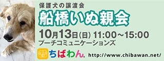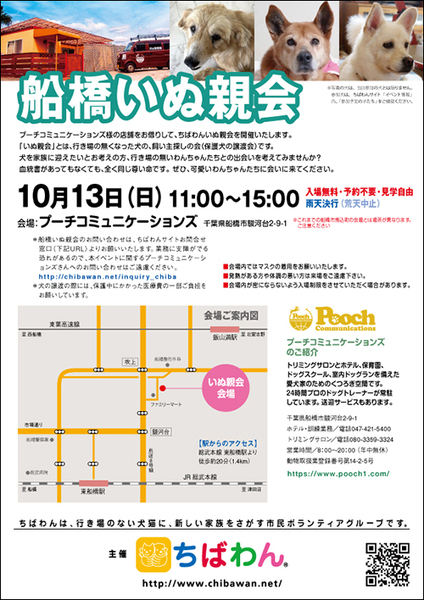 | イベント内容 | 10月船橋いぬ親会のご案内です。 poochさんのご厚意により、プーチコミュニケーションズ(船橋市駿河台)のドッグランをお借りして「船橋いぬ親会」を開催することになりました。 屋根付きのドッグランでの開催になります。 【ちばわんからのお願い】 ①会場内ではマスクの着用をお願いします。 ②発熱がある方や体調が悪い方は来場をご遠慮ください。 ③会場内が密にならないよう入場制限をさせていただく場合があります。 開催日:10月13日(日)11:00~15:00 屋外開催(屋根付きドッグラン) 小雨決行 場所:プーチコミュニケーションズ 千葉県船橋市駿河台2-9-1 【アクセス】 飯山満駅から徒歩約20分 JR東船橋駅から徒歩約20分 県道8号線 吹上交差点~駿河台交差点間にあるファミリーマートの裏手になります。 リサイクルショップとファミリーマートの間の道へ進み、最初のT字路を左折してください。 ※店舗の駐車場は5台分のみとなりますので混雑時にはご利用いただけない場合がございます。 満車の場合はコインパーキングをご利用下さい。 《お知らせ》 ◆会場ではチャリティグッズを販売します 売上金は保護した犬猫の医療費など、 ちばわん活動費として大切に使わせていただきます 《お問い合わせ》 いぬ親会について:http://chibawan.net/inquiry_chiba ※いぬ親会当日はメールが見られません。また、お問い合わせの際は、必ず「具体的な件名」を入れて多数の迷惑メールと区別がつくようにお願いいたします。 ※本イベントに関するPoochさんへのお問い合わせはご遠慮ください。 船橋いぬ親会イベントホームページ https://chibawan.net/event/20241013-funabashi-dog ちばわんホームページ https://chibawan.net/ |