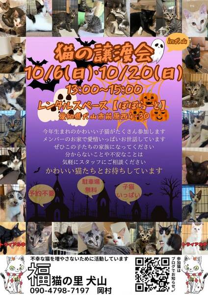 | イベント内容 | 【ココがポイント!】 ★ウイルスチェックなど健康診断済み! 【日時】 10月6日(日)13~15時 【場所】 レンタルスペースぽぽらーと (犬山市前原西4丁目30) 予約不要 広々駐車場あり 福猫の里 犬山「福猫の里便り」 https://hukunekonosato.hatenablog.com/ 【お約束】 当日、会場での猫の引き渡しはしておりません。 後日ご自宅までお届けします。 お試し飼育(トライアル)を1週間〜2週間程して頂き、双方が納得の上で正式譲渡となります。 譲渡の際は、医療費(ワクチン代等)、活動協力費の負担をお願いしております。 ・ペット可のお住まい ・完全室内飼育、終生飼育 ・適切な医療措置 ・不妊手術の実施と報告等、お約束があります。 《 譲渡に関するお願い 》 ◎猫の負担を考え、東海3県で車移動が1時間以内にお住まいの方。(遠方の方はお断りしています。)※通行料がかかりましたらご負担頂く場合もあります。 ◎高齢者のみ世帯への譲渡はお断りしています。託せる方がいれば、一緒に来場下さい。 ◎譲渡は、無償ではありません。猫によって費用が違いますので保護主にお尋ね下さい。 |