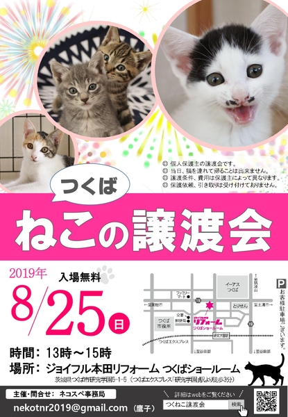 | イベント内容 | つくば市研究学園で保護猫の譲渡会やります! 涼しくて綺麗なショールームで未来の家族をお探しください。 可愛い猫さんたちがずっとの家族との出逢いを待っています。 子猫から大人猫まで20匹が参加予定。 参加猫はブログで随時紹介しています↓ https://nekospe.localinfo.jp/posts/6761759 入場無料・予約不要 お気軽に足をお運びください。 ※無料駐車場ございます。 |