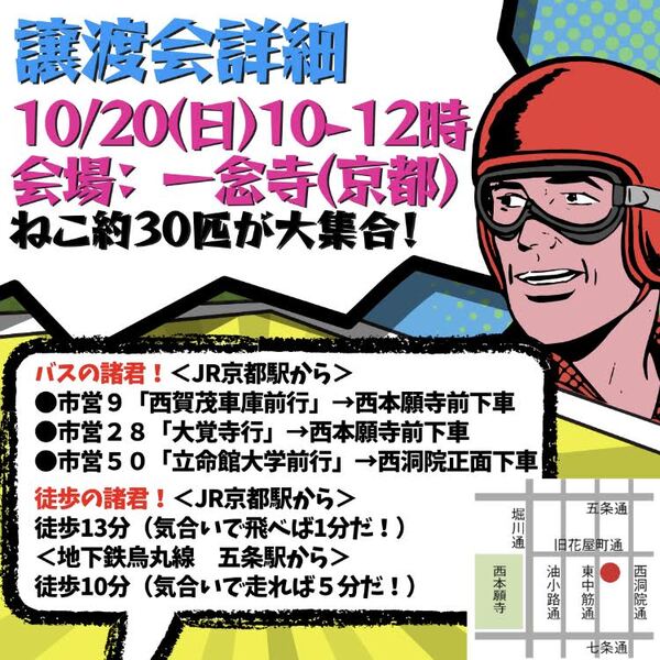 | イベント内容 | 【10/20(日) 譲渡会in京都市✨】 ?譲渡会詳細? ◆日時:2024年10月20日(日) 10:00-12:00 ・ ◆住所:一念寺 (京都市下京区柳町324) ・ ◆入場料:無料 ・ ◆アクセス 【バス】 京都駅から「市バス50」 立命館大学前行き、 西洞院正面 下車 徒歩1 【徒歩】 西本願寺より東に徒歩3分 京都駅より北に徒歩13分 ・ ⚠️参加猫について ※「ねこ約30匹」とは 譲渡会の平均参加頭数であり 前後する場合がございます? 参加動物は、10月上旬に確定します 〜〜〜〜〜〜〜〜〜〜〜〜 ・ 譲渡会は、里親に興味がある方、 お子様連れのご家族、 預かりボランティアを やってみたい方も大歓迎?✨ ・ チャリティーグッズ販売では 多数の新しい猫グッズや ここでしか買えない 英字の犬猫ファイルもありますよ✨ ・ 今は動物を迎えられない方も、 ぜひお越しください♪ ・ 1匹でも多くに ご縁が繋がりますように? |