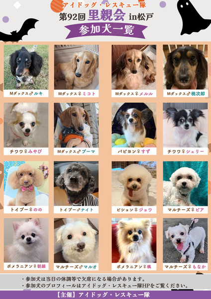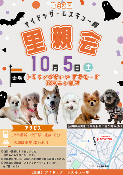 | イベント内容 | 第92回アイドッグ里親会(松戸)のお知らせ ・日時:10月5日(土)13:00~16:00 ・会場:トリミングサロン アラモード 松戸古ヶ崎店 https://www.ts-alamode.com/salon-list/matsudo-kogasaki/ ・住所:千葉県松戸市古ケ崎763-1 ・アクセス 常磐線 松戸駅より徒歩16分 店舗駐車場20台あり ※犬をお連れの方は、オムツやマナーベルトをご着用ください。 フリーで遊ばせることは出来ませんので、リードの着用をお願い致します。 【チャリティTシャツ販売】 里親会会場受付エリアにて 「アイドッグ チャリティTシャツ」を販売いたします。 <価格>3,000円(税込) ・数量限定につき売り切れの場合はご了承ください。 ・売上は全て保護犬の医療費や保護費にあてさせていただきます。 〜皆様のお越しをお待ちしています〜 |