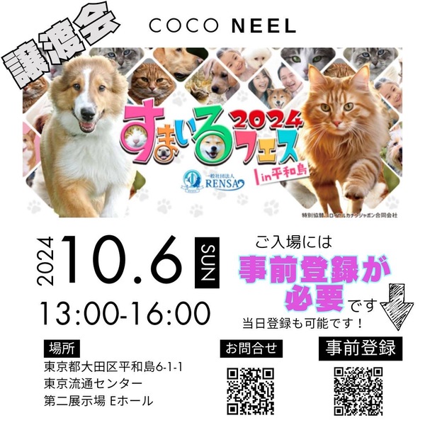 | イベント内容 | すまいるフェス2024 in 平和島 すまいるフェス2024 in平和島の譲渡会に参加させていただきます 【日時】2024年10月6日(日) 13:00~16:00 【場所】〒143-0006 東京都大田区平和島6-1-1東京流通センター 第二展示場 Eホール 【主催】一般社団法人RENSA すまいるフェス実行委員会 【特別協賛】ロイヤルカナンジャポン合同会社 【入場】無料 ※事前登録が必要 ※当日登録も可能 ⚠譲渡会場エリアは犬猫の同伴出来ません。 詳細は【すまいるフェス2024 in 平和島】HPをご確認お願いします。 https://smilefes2024.jp/ ━━━━━━━━━━━━━━━ 会場にてお見合いをご希望の方は、譲渡条件をよくご確認のうえ、里親希望エントリーフォームより事前エントリーお願いします。 詳細はHP、ブログからご確認ください。 ━━━━━━━━━━━━━━━ ?COCO NEELオリジナル チャリティーグッズを譲渡会特別価格にて販売します! ※売上は保護っ子達の医療費・活動費として大切にお預かりさせていただきます?♀️ ━━━━━━━━━━━━━━━ |