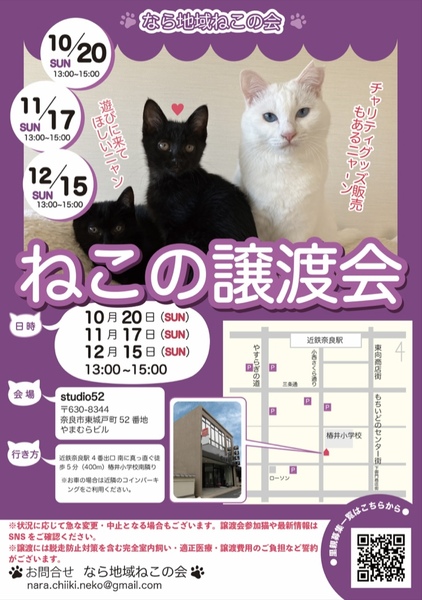 | イベント内容 | 毎月奈良市ならまちにて猫の譲渡会を行っております。 会場には会の保護猫ちゃんたちをはじめ、個人で活動されているボランティアさんが保護した猫や一般の方に保護され里親さんを探している保護猫など、沢山の保護猫たちが里親さんとのご縁を待っています。 また、会場ではチャリティグッズ販売も行っております。 皆さまのお越しをお待ちしております(=^・^=) 参加猫の詳細は https://www.facebook.com/nara.chiiki.neko/ https://www.instagram.com/nara.chiiki.neko/ にて告知します。 ※譲渡会の急な変更がある可能性もございます。最新の情報はSNSにてご確認お願いいたします。 |